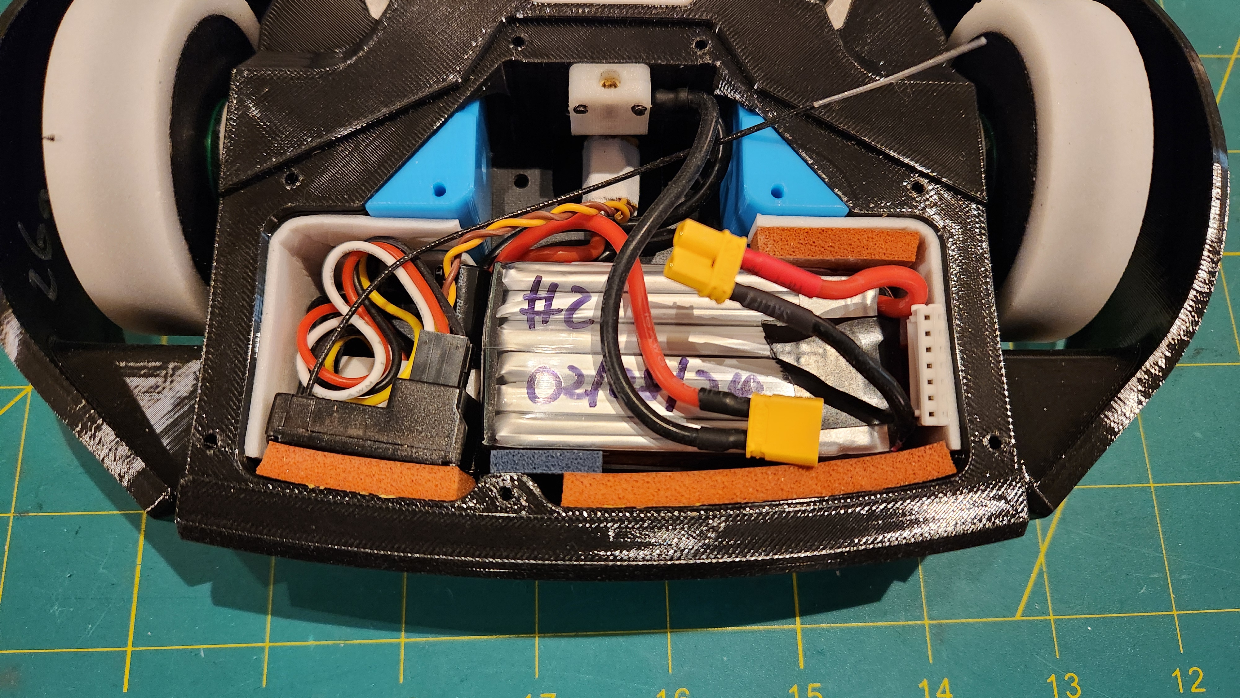 At nearly 0.7 lbs, this motor was NOT light. But luckily the rest of the robot supported this goal. Using the existing chassis footprint (because I am lazy), the largest 6s battery I could fit was 550 mah which is small when you compare the watt-hours of the previous battery (4s, 1000mah) but luckily lighter weight. The lynx switch also saved weight and space by replacing the dual link setup I previously had for accomplishing precharge. In terms of space and weight, the repeat esc was maybe 1:1 with my old beetle setup but it did simplify wiring a lot and it supports the 6s voltage.