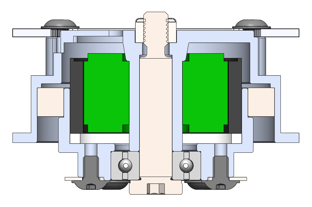 This is the old hubmotor setup. It consists of two custom parts and a few COTS or MOTS parts. The custom parts are the base (where the stator is mounted) and rotor (where the blade is attached). The stator and flux ring are pressed into their respective housings with the assistance of the green sauce. A shoulder bolt binds the assembly together and the direction of bearing counter bores keep the assembly from coming apart. This setup uses one thin-section bearing around the can; this is still a requirement I’ll be maintaining the same overall arrangement.