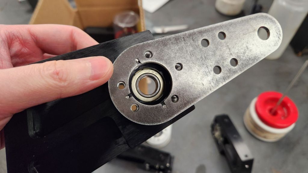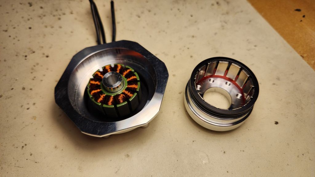 This unit I designed in my classic two-bearing, two-piece design I use for all my other hubmotors. A main stator mount that houses a large ring bearing and a rotor which houses the magnets, flux ring, and small bearing. The idea is pushing the complexity into a few parts and guaranteeing the relationship of critical components machining tolerances rather than assembly nuances. Two small pilot features locate the position on each arm plate and feature a step-down shelf to control the spacing. A large belleville washer goes between the arm plate and the small bearing to preload the stack and take up space. A long bolt goes through the center of it all to compress the assembly together.