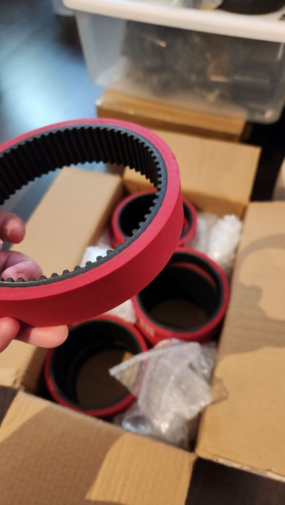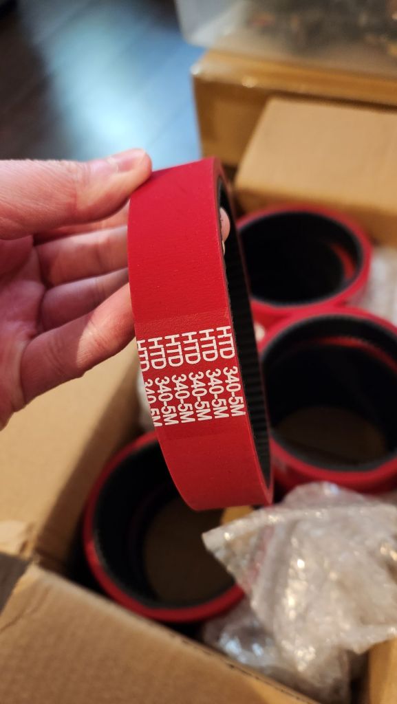 I first bought some samples from AliExpress to become familiar with the materials and specifications. Once I understood the specs, I had a set custom made from Yonghang Belt Co. in China. 5M, 340 teeth, 25mm width with a thick 6mm LINATEX rubber coat.