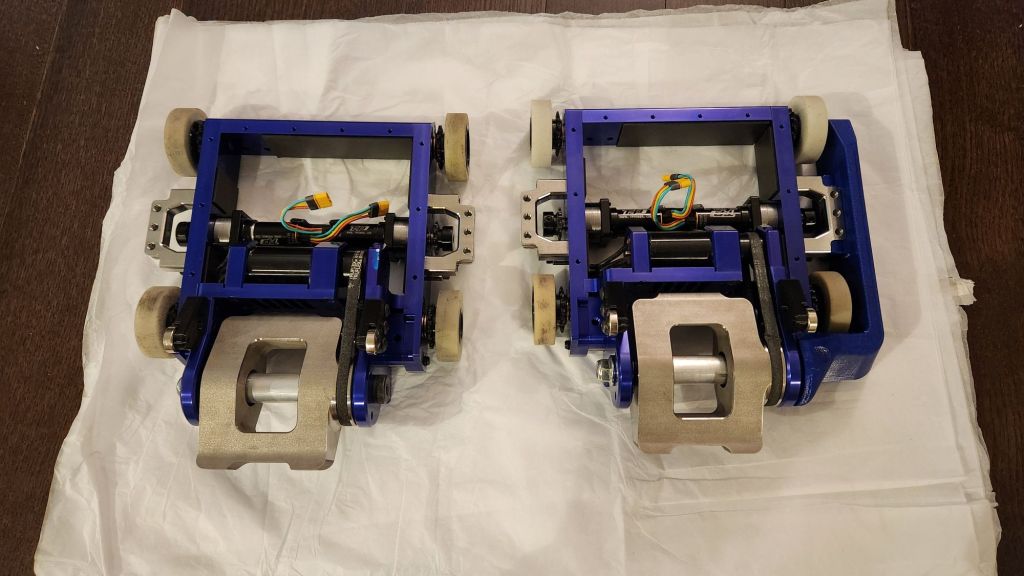 MegatRON had a much more ambitious list of changes I wanted to make but needed testing on critical subsystems before committing to an entirely new build. I decided to reduce the scope to development of a featherweight-class hammer saw hubmotor and treads via rubber-coated timing belts.