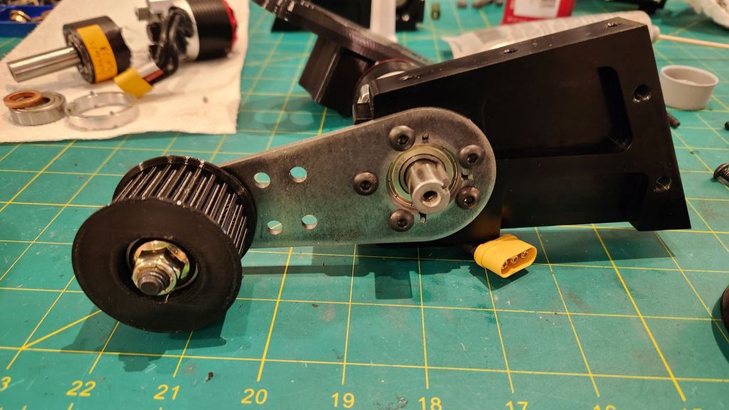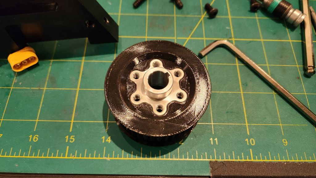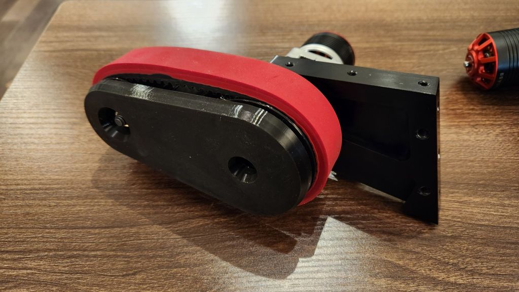 In the interest of time, I made plans to retrofit the existing chassis for treads. I match drilled the side billet to accept a 3mm AR500 plate which would mount the idler pulley. The idler pulley is printed TPU mounted on a single cantilever shoulder bolt; a bearing/spacer/belleville stackup ensures the bolt is rigid and perpendicular to the plate face. The main pulley is driven by an aluminum hub I outsourced to LT Century Prototype which should help better distribute torque from the output shaft keyway. I sized the main pulley, also printed TPU, such that its diameter with a belt was equivalent to the existing wheel.