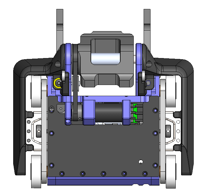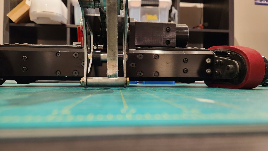 This is where the treads come in. Essentially acting drivable wheelie bars, they would extend the wheelbase backwards to support the weight of the arm when it was back. The arm could then be suspended from the floor and contribute its full weight to traction. An added bonus was the springy behavior of the treads. The belts were coated with rubber as a circle and thusly wanted to maintain that shape even when stretched between the span of two pulleys; they would bulge a bit on the straight lengths of belt. This turned the straight sections of the belt into free springs that increased the duration of contact with the floor.