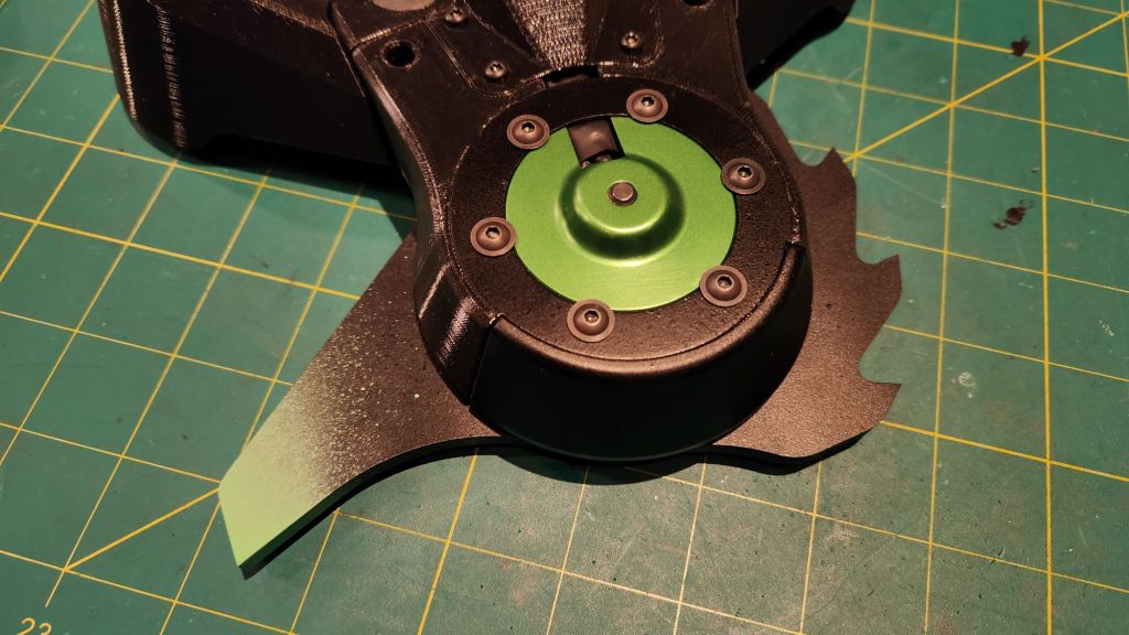 The blade is still mounted using the clamp flange method but I upsized the screws to M4 and reduced their quantity to 8. Speaking of which, I decided to invest in S7 tool steel blades to deal with all the AR blades and armor we see these days. This new design has an aggressive bite and no cutouts for maximum durability. Of course I had to give it a sweet paint job.