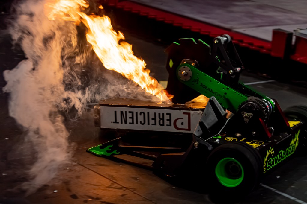 SawBlaze is a fierce competitor and fan favorite of the competition and unscripted reality TV show “BattleBots”. Previously armed with a 16″ fireman’s rescue saw and 15kW of cutting power, it now takes a blunt force approach to slicing using its innovative “hammer saw” technique. Despite the change in primary weapon, SawBlaze’s most notable feature remains; the lime green flamethrower powered by propane and a mad-scientist colorant cocktail.